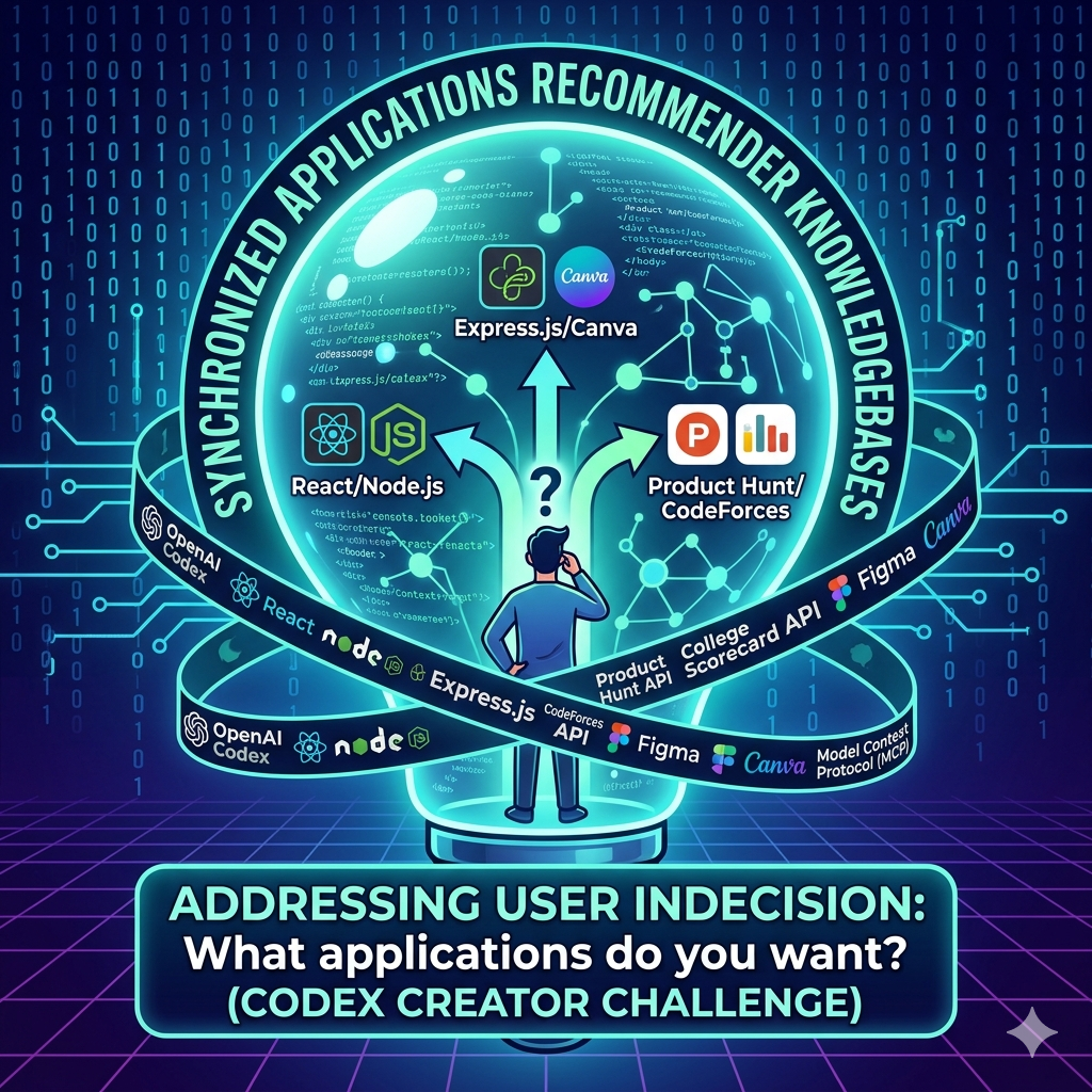 Currently developing application intended to address the problem when people don't know what they want for the Handshake x OpenAI Codex Creator ChallengeThe tools, frameworks, and technologies used in this project include: OpenAI Codex, OpenAI API, React, Node.js, Express.js Product Hunt API, College Scorecard API, CodeForces API, Figma, Canva, and Model Context Protocol (MCP).