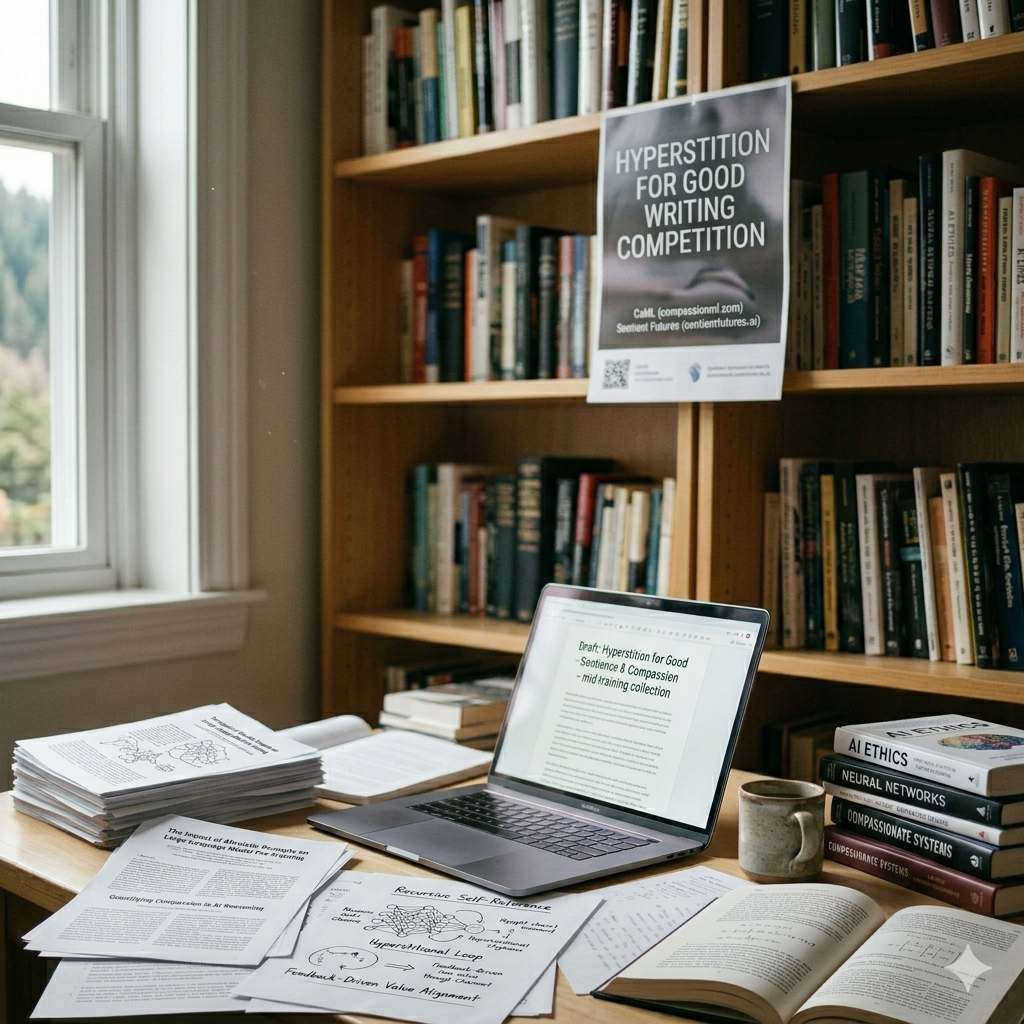 Currently developing a paper for the Hyperstition for Good Writing Competition. The idea behind hyperstition is the research that suggest that writing about AI reasoning with compassion can actually shape how future AI behaves. In other words, we can help influence how AI treats life. CaML (https://www.compassionml.com/) and Sentient Futures (https://www.sentientfutures.ai/) are currently collecting writing to share with AI labs (mid-training)
